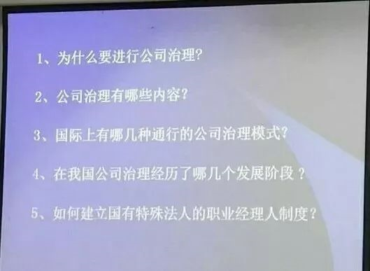 在分析完案例后,刘老师引出讲座的主体——为什么要进行公司治理;公司治理有哪些内容;国际上有哪几种通行的公司治理模式;在我国公司治理经历了哪几个发展阶段;如何建立国有特殊法人的职业经理人制度。