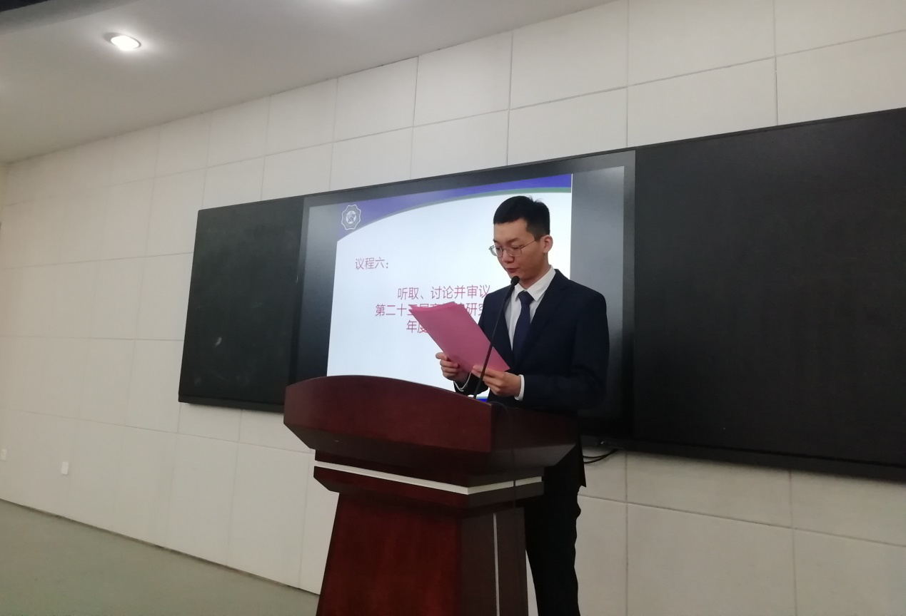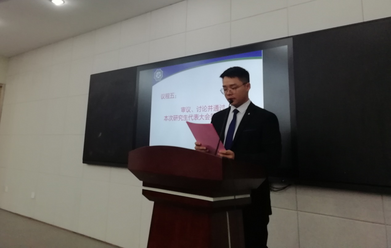 大会听取、讨论并审议通过了李阳同学代表PA视讯集团官网所做的《PA视讯集团官网第二十四次研究生代表大会筹备工作报告》和李叶钦同学代表PA视讯集团官网所做的《第二十三届PA视讯集团官网研究生会年度工作报告》。