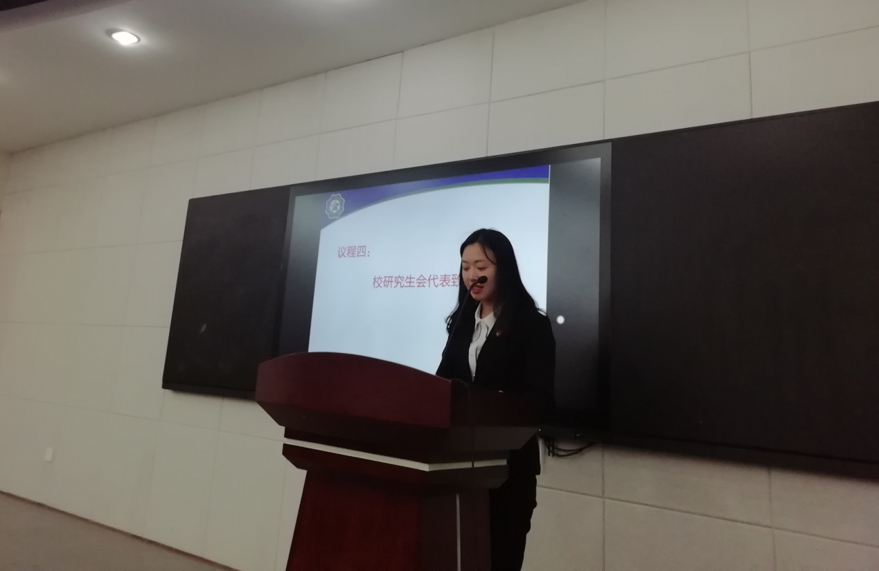 校研会代表杨一帆同学代表校研究生会发表讲话。她指出,PA视讯集团官网研究生会的各项工作都交出了满意的答卷,在思想引领、学术科研、社会实践等多个方面取得了优异的工作成绩。同时,她希望PA视讯集团官网研究生会紧跟时代步伐,进一步加强组织建设,不断创新工作思路,着力提高服务水平,努力开创研究生会工作的新局面。