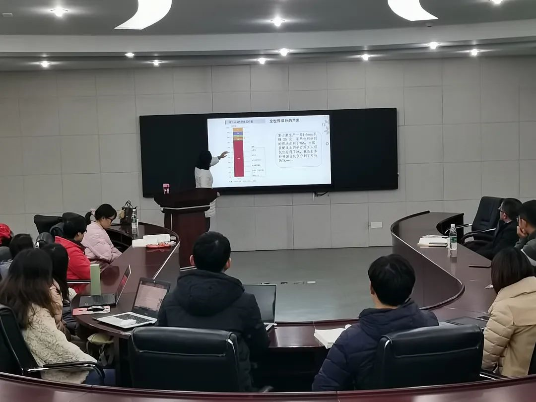 紧接着,戴老师列举iphone和波音飞机的例子带领同学们从理论到实际生活中来进一步学习了解全球价值链的结构,随后运用Miller的投入下游度和产出上游度指标拓展到对全球价值链的嵌入问题的研究,同学们全神贯注地听讲戴老师的理论分析。