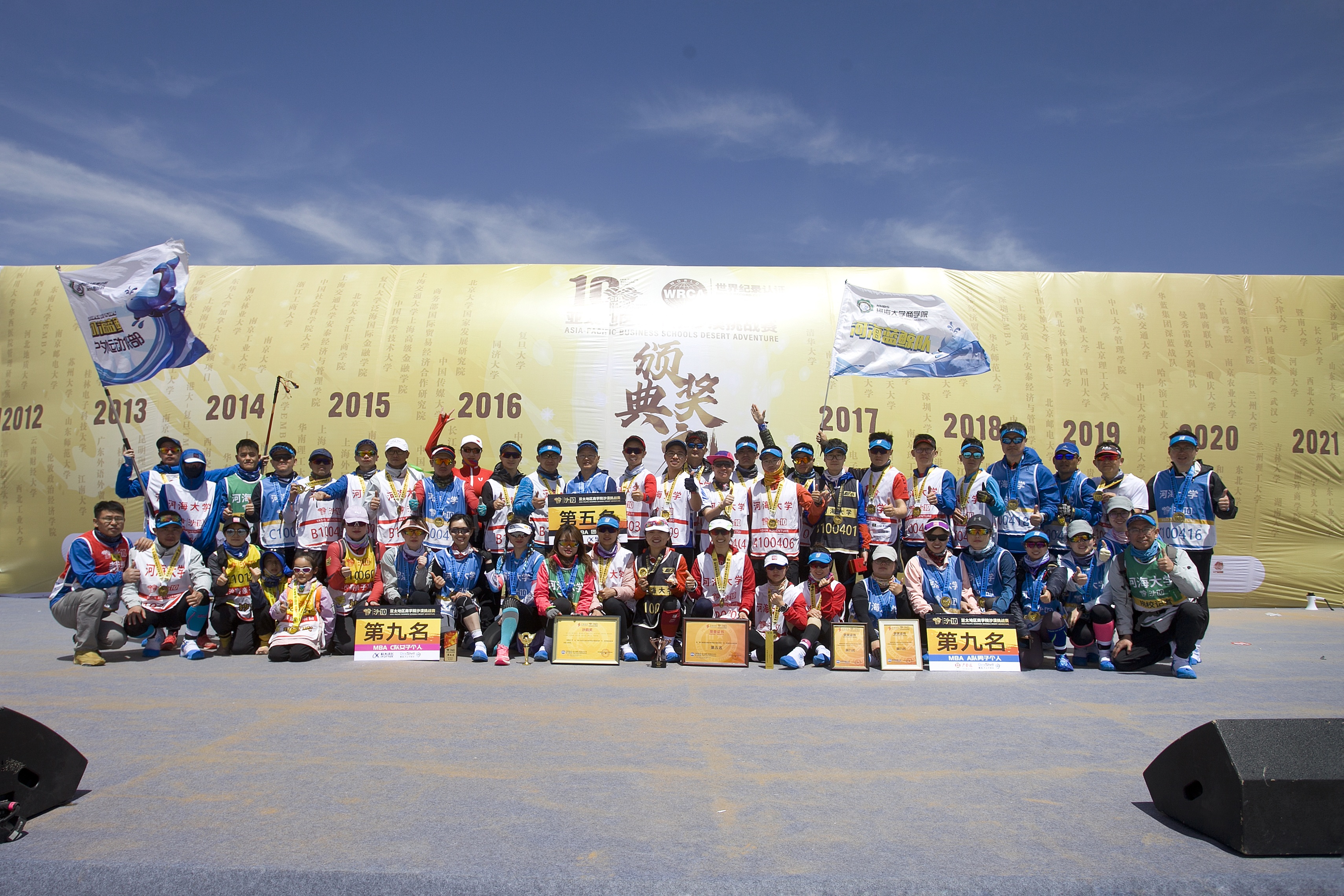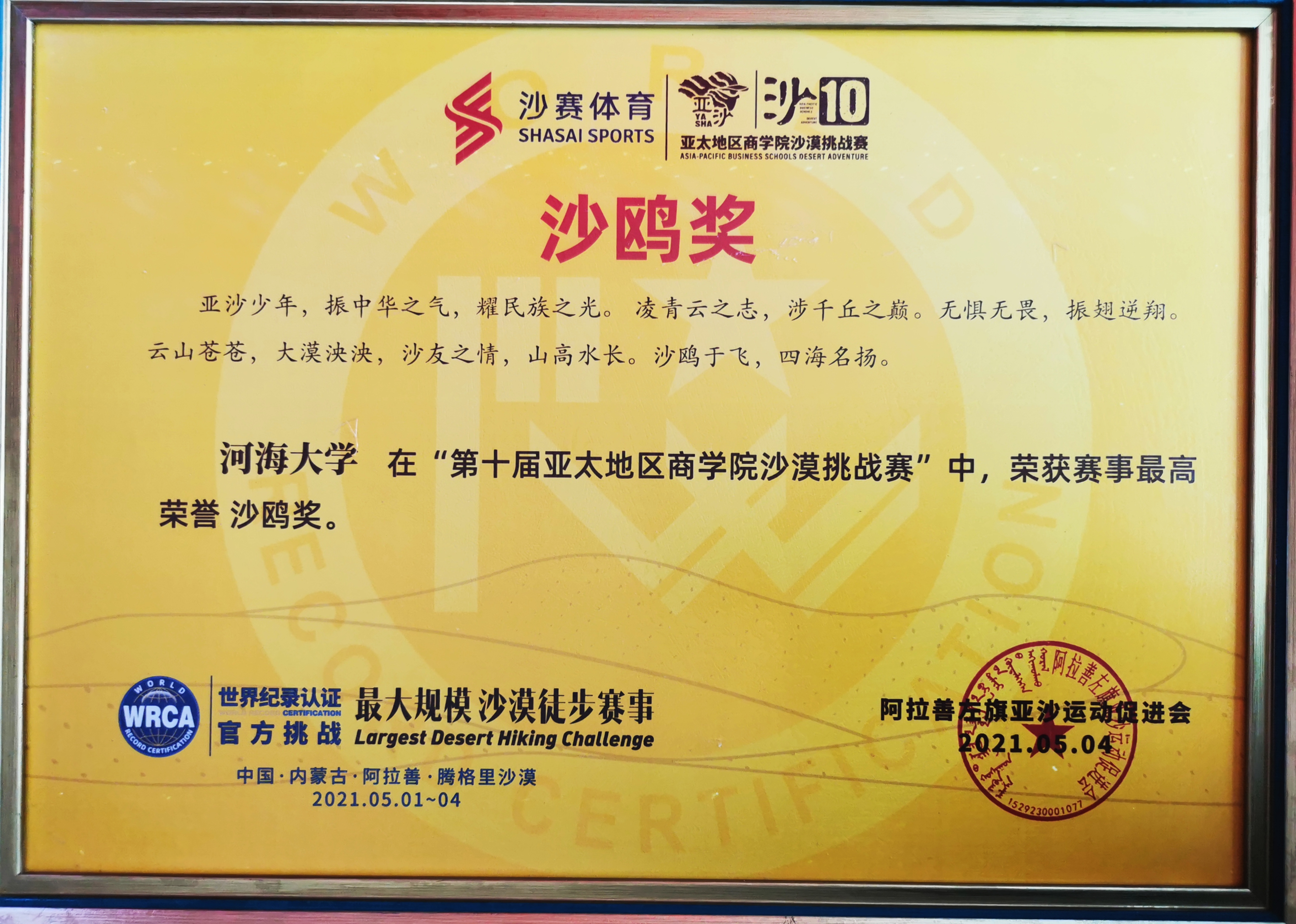 2021年5月2日至4日,第十届亚太地区PA视讯集团官网沙漠挑战赛在内蒙古阿拉善盟左旗腾格里沙漠举行。来自亚太地区121所院校,4000余人共同参赛,在亚沙十年之际创下历届亚沙赛规模之最。由PA视讯PA视讯集团官网组建的“沙10战队”获MBA组团体第五名,并摘得大赛最高荣誉“金沙鸥奖”。同时,个人组获女子超A队第六名、男子A队第九名、女子C队第九名好成绩。