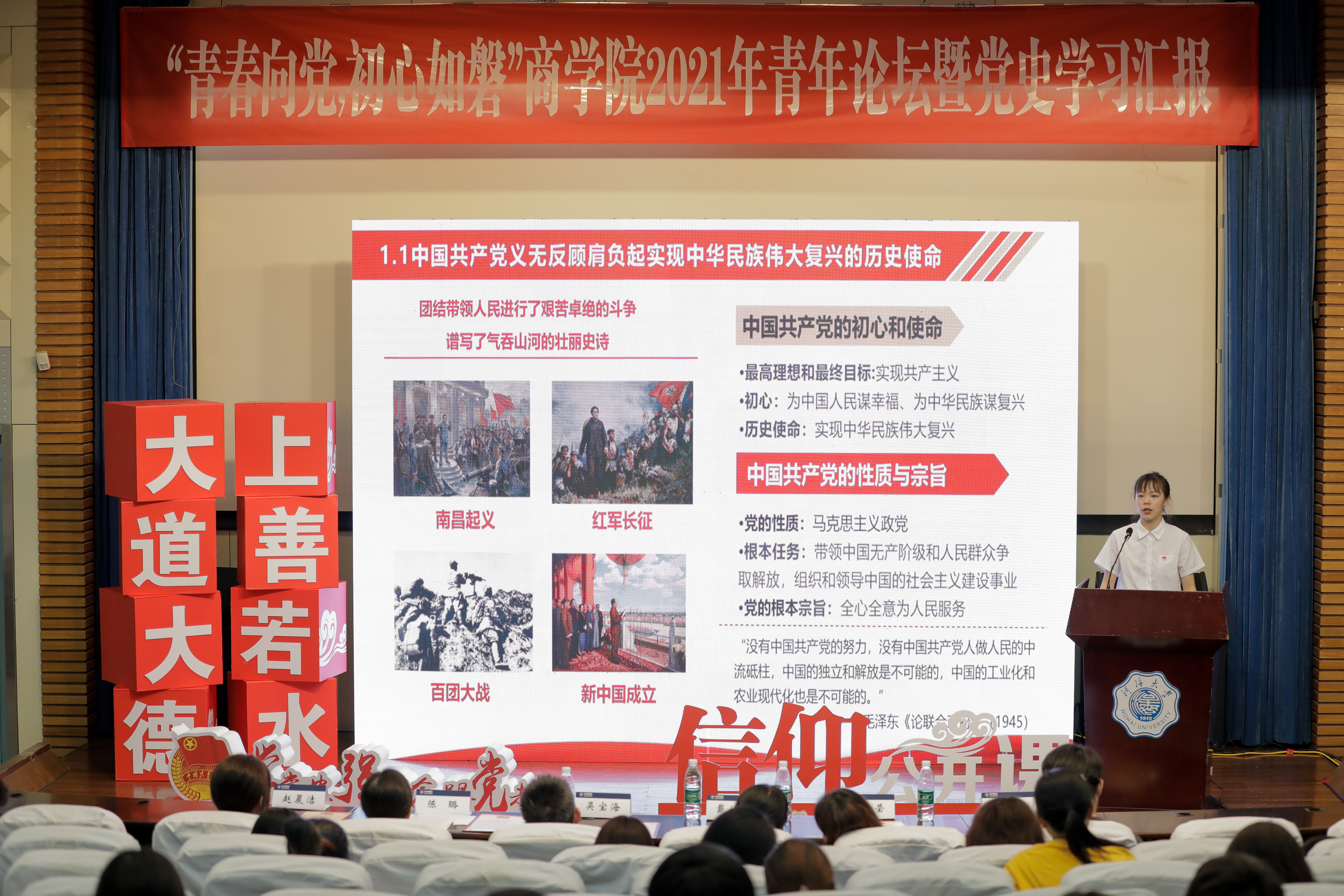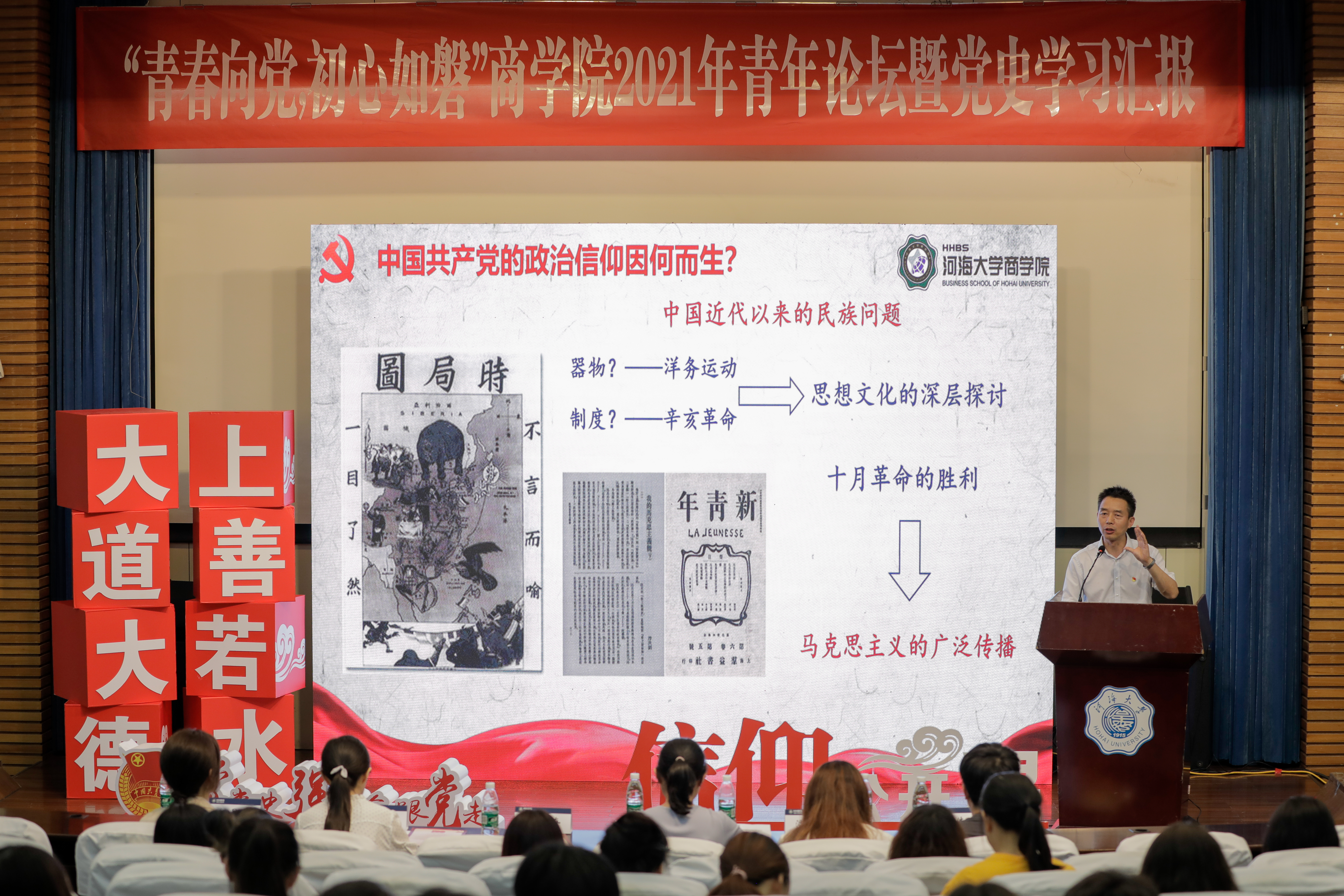 公司党委吴宝海书记为同学们讲述了一堂深入人心的主题党课《在党史学习中筑牢青年马克思主义信仰》。他从“中国共产党的政治信仰因何而生?”这一问题引入,为同学们讲述了中国共产党百年历程中的“四件大事”——开天辟地、改天换地、翻天覆地、惊天动地,生动讲述了中国共产党一经成立就把实现共产主义作为最高理想和最终目标,确立起为中国人民谋幸福、为中华民族谋复兴的初心和使命。同时以习近平总书记对青年的希望与嘱托为指引,希望同学们学史明理、学史增信、学史崇德、学史力行,做堪当民族复兴重任的新时代河海商科青年!