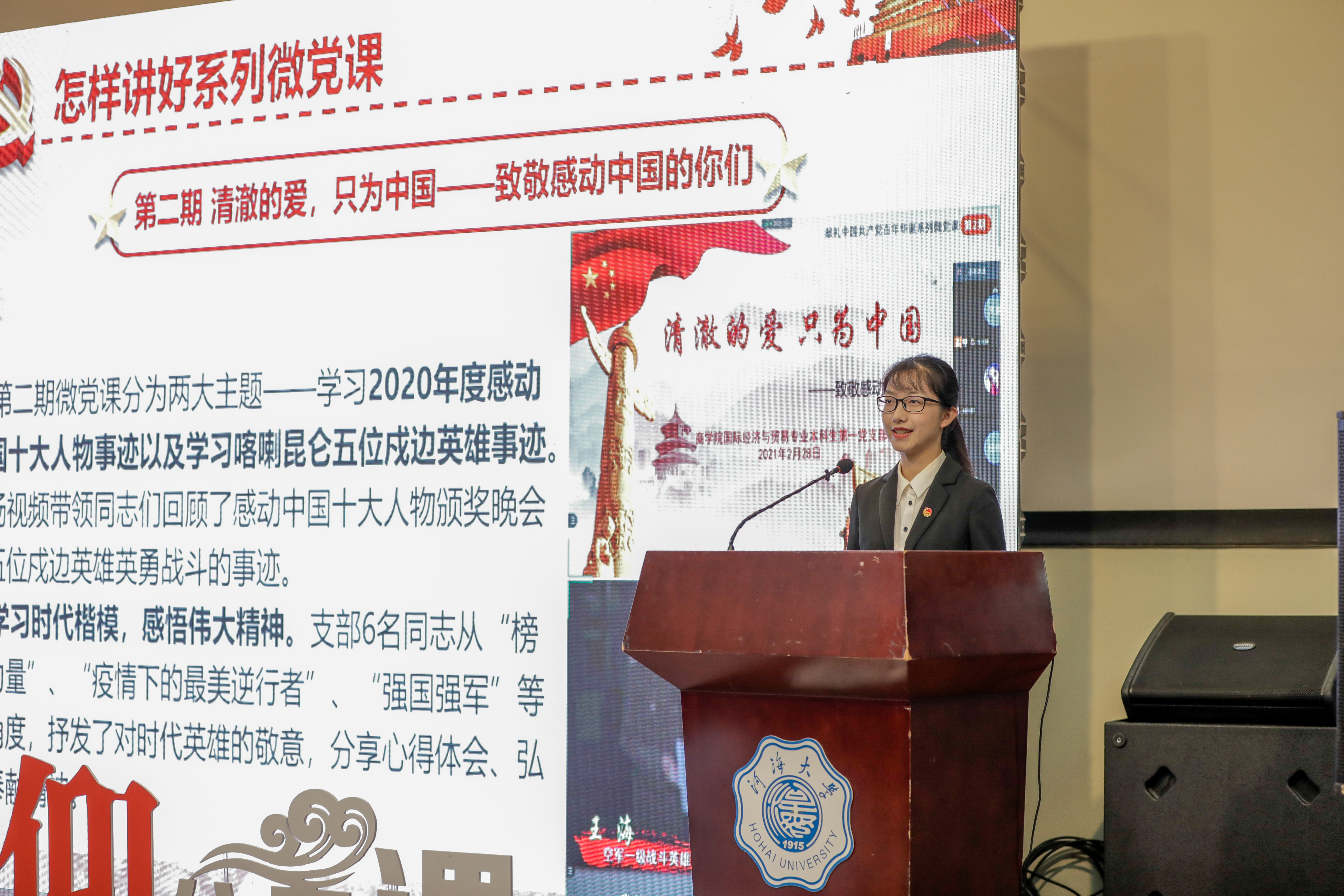 公司团学骨干代表赵培培、陆瑶、魏然、吴亚添、李林等同学朗诵《思我辈今日安乐,感念前辈艰苦之奋斗》。工程管理专业本科生党支部窦睿同学、国际经济与贸易本科生第一党支部姚可越同学、2020级硕士第二团支部书记梁伟婷同学分别从党史学习、党课宣讲、党日活动等方面,分享了党史学习主题活动的心得体会。活动最后,全体师生重温入团誓词,齐唱《歌唱祖国》,表达了对祖国母亲、对中国共产党的感激和热爱之情,充分感受中国共产党波澜壮阔的百年征程和历久弥坚的百年初心。
