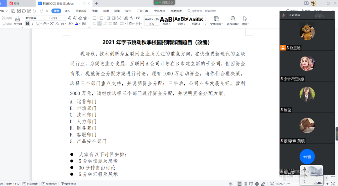 10月3日下午,2018级开展无领导小组面试模拟活动,本次活动邀请了景瑞地产(集团)有限公司HR、PA视讯集团官网2021届员工黄瑱担任面试官,2018级陈莹、陈欣怡、李翠林、佘月、曹金子、王凯祥、游雅婷等同学参加了本次活动。通过体验改编的2021年字节跳动秋季校园招聘无领导小组面试题目和面试的流程,同学们对无领导小组面试有了一定的了解,在模拟面试结束后,黄瑱同学介绍了自己在无领导小组面试过程中遇到的困难和积累的经验,以期自己的经验分享能够帮助到即将面临秋季校园招聘的学弟学妹们。