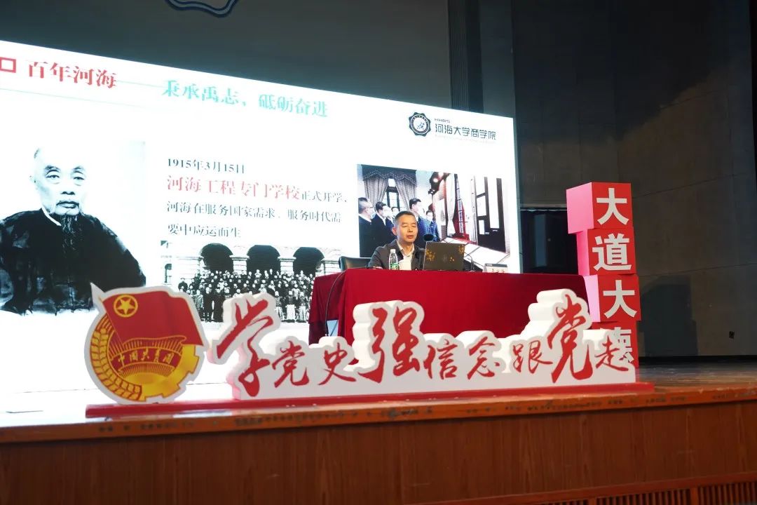 吴宝海书记以“请党放心,强国有我,奏响新时代的青春之歌”为题,从“百年河海:秉承禹志,砥砺奋进”“河海商院:开拓进取,培英育才”“时代青年:矢志奋斗,强国有我”三个层面向同学们讲授理想信念课。从河海历史到公司历史,吴书记带领同学们感受师生员工不断秉承禹志的光辉历程,河海工程专门公司在近代著名爱国实业家、教育家张謇等人创办下正式开学,百余年历程,始终与祖国共命运,与时代同步伐。吴书记希望同学们传承精神,坚定信念,明确目标,矢志奋斗。