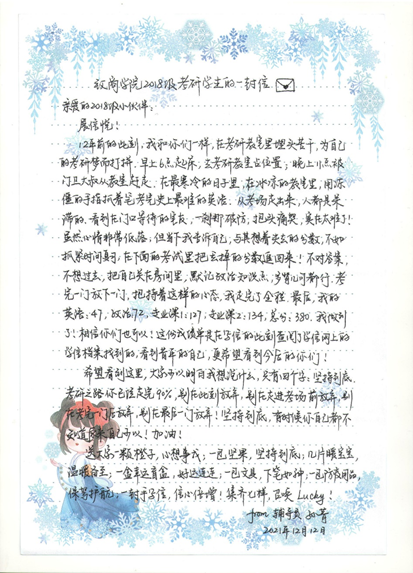 同学们纷纷表示非常感谢公司领导和各位老师冬日送来的温暖,非常开心能够收到公司的礼物,表示会在冲刺期科学规划,掌握关键知识,提高学习效率,互相帮助,争取以优异的考研成绩回报公司。考研路上虽有无数的艰难险阻,但我们相信,这段奋斗的时光将会是同学们人生中的宝贵财富,青春的汗水定会灌溉出绚丽之花,预祝考研学子心想事成、金榜题名!