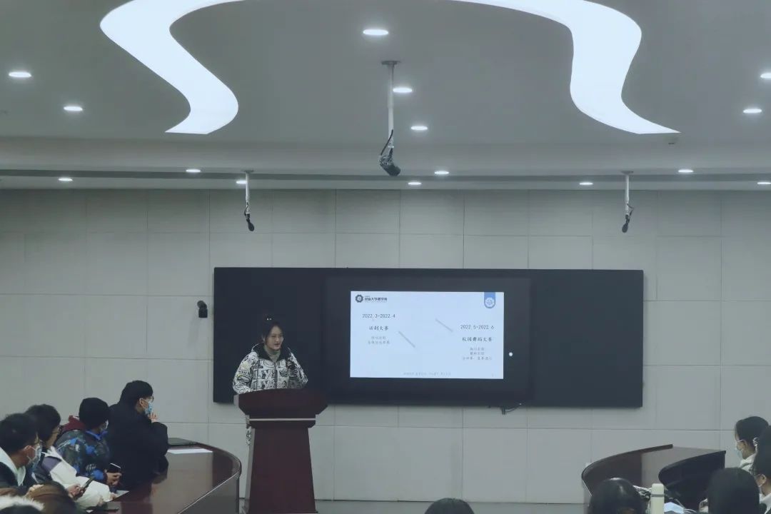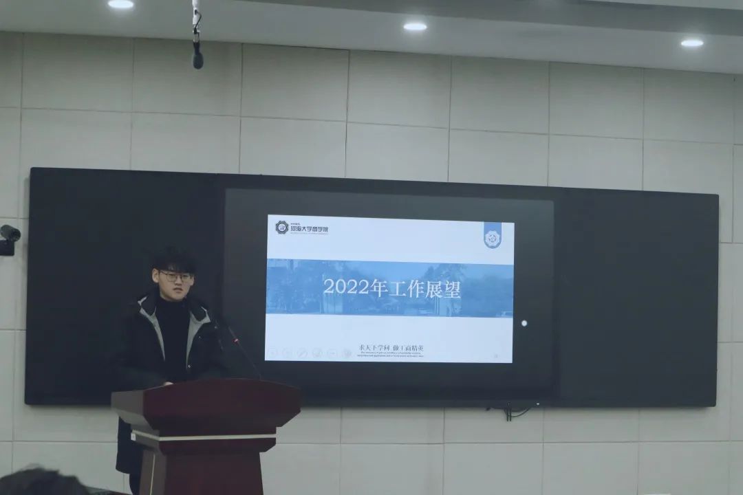 接下来,员工会五个部门负责人代表上台进行了述职汇报。吴欣然首先介绍了当前学习部的部门简介与分工,接着从学业备考、商苑讲坛、考试动员、系列推送四个方面进行了学习部学风建设方面的工作总结,最后针对学习部学风建设等活动与部门内部培训进行了系统的工作规划。李昱臻同学首先对文艺部在2021年所承办的活动与日常推送等工作进行了总结与反思,并对各个活动进行了介绍与图片展示,最后对下一年文艺部将要举办的大型活动如校园舞蹈大赛等进行了规划。体育部负责人刘秩凡同学先是介绍了体育部今年的推送项目与体育赛事的总结,之后提出了明年体育部的工作计划。其目标在于完善组织各项工作,创新体育活动形式,吸引更多员工参与到体育活动之中。黄俊卿同学的汇报针对部门分工、工作总结、未来规划三个部分展开,包括了优秀员工信息收集整合与员工返校等多项工作,最后对于自身部门存在的问题与不足进行分析,并提出切实的行动方案。吴鹏同学对今年的工作包括党史宣讲、社区风采、咨询服务与二十四节气稿件推送等方面进行了年终总结,并对未来稿件的创新与完善员工发展工作室与线上咨询群进行了规划。同时,他对下一年的组织管培与宿舍美化大赛做出了新的设想。