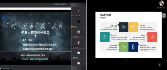 首先,蒋涵总经理分享了与跨境电商项目结缘的过程,2017年大学毕业后的创业经历。他重点从创业团队组建、品牌创立、公司运营等方面进行了详细的阐述,分享了他在创业过程中的收获与感悟。蒋涵总经理以自己的创业项目:老年大学项目为例,向大家展示了创业的全过程,分享了创业方向选择、创业前期准备工作、相关机构对接、产业联动与融合、后期宣发等方面的注意事项,给参加活动的同学很多的启示。