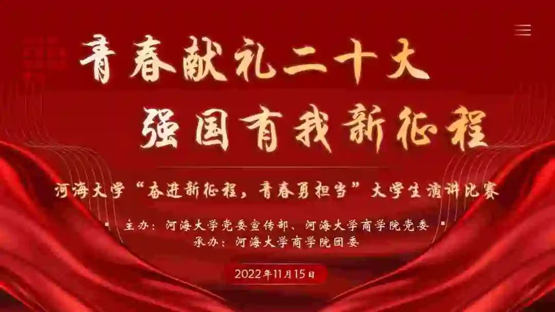 为深入贯彻习近平新时代中国特色社会主义思想,认真贯彻落实中国共产党第二十次全国代表大会精神,根据教育系统“青春献礼二十大,强国有我新征程”迎接学习宣传党的二十大主题宣传教育活动安排,由党委宣传部、公司党委联合举办的“奋进新征程,青春勇担当”演讲比赛于2022年11月15日在江宁校区博学楼A100成功举办。