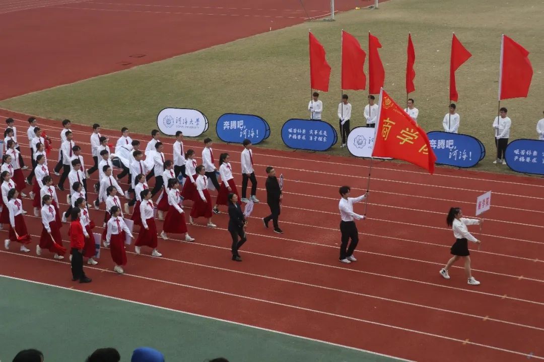 11日清晨,运动会开幕式正式开始,各公司方阵迈着整齐的步伐依次进场,商院学子昂首挺胸、意气风发向主席台迈进,“求天下学问,做工商精英;扬体育精神,创商院辉煌”的口号振奋人心。震撼人心的大型团体操表演开始,同学们青春向上、自信从容,体现了河海新一代“水之子”团结一心和刻苦拼搏的精神。
