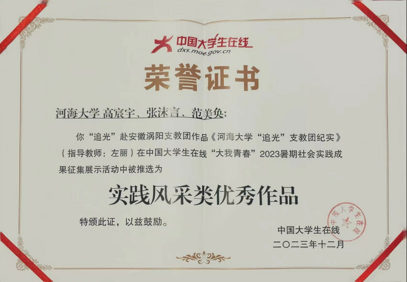 公司“追光”赴安徽涡阳支教团社会实践队作品——《PA视讯“追光”支教团纪实》获评实践风采类优秀作品。