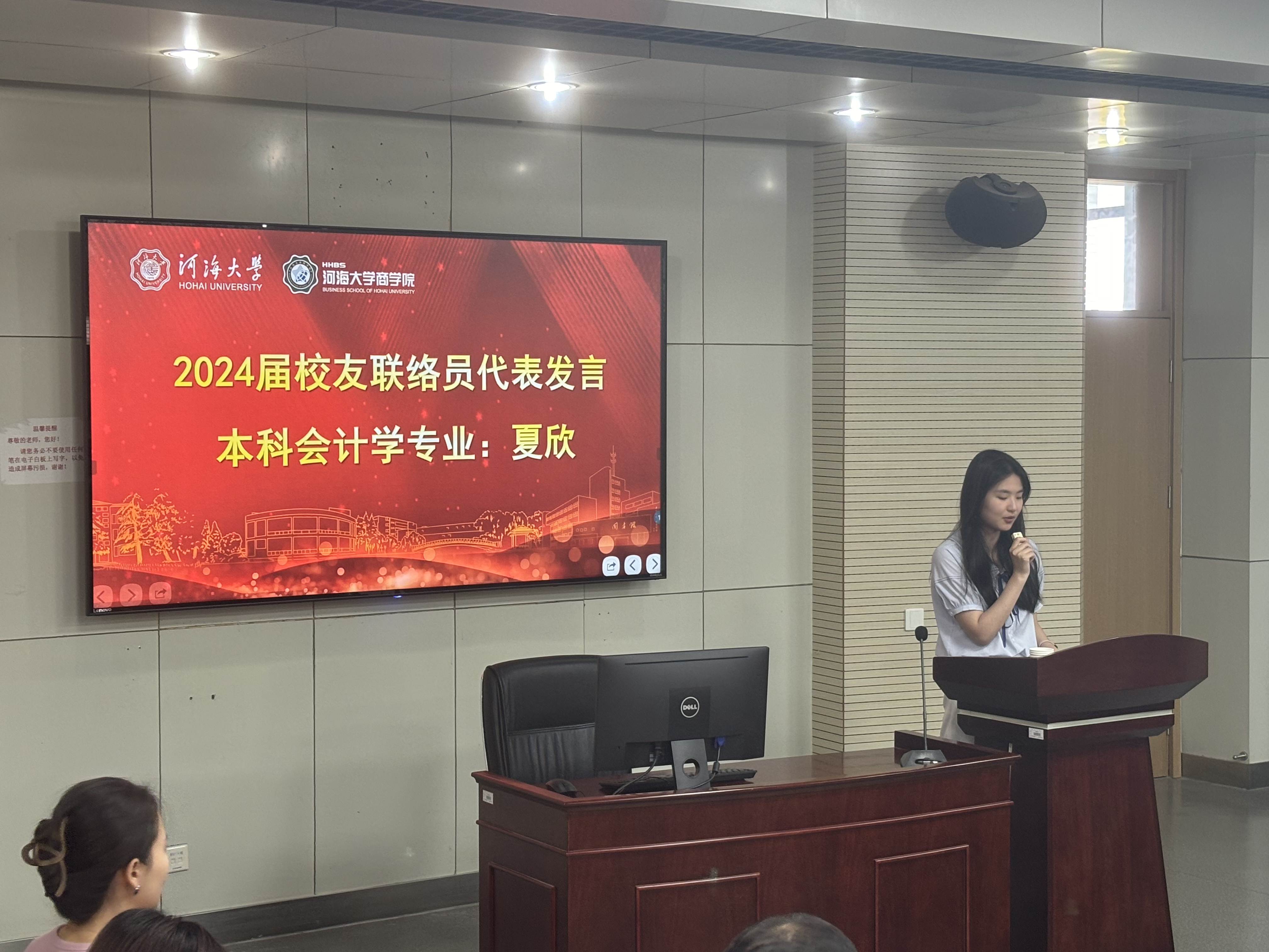 2020级会计学本科毕业生夏欣同学代表受聘员工联络员发言,她回忆了在校的成长经历与恩师教诲,感谢公司的培养与信任,承诺恪尽所托,积极强化员工工作意识,认真履行员工联络员的职责。