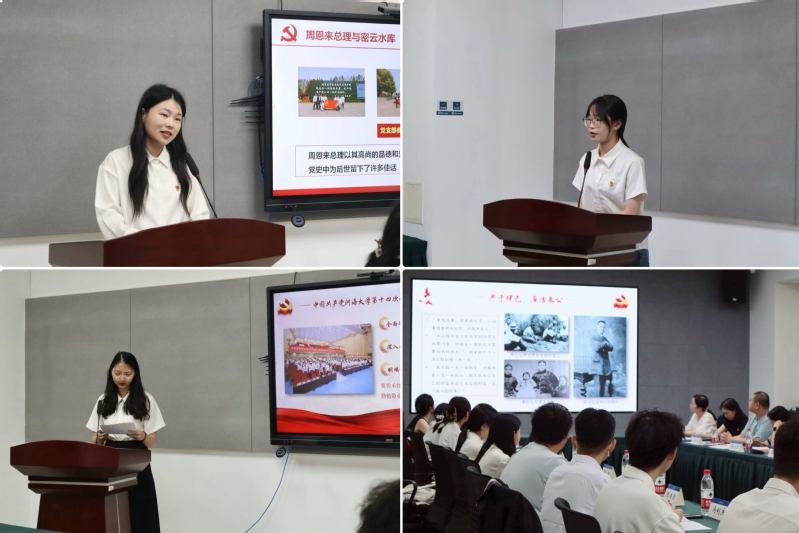 员工党支部青年党员代表分享了党纪学习教育开展以来的学、思、践、悟。2024届毕业生党员李林介绍了在党支部“周恩来纪念馆”研学活动中了解到的周恩来总理与密云水库的故事,分享了“水以清为贵,人以廉为尊”的道理,倡议青年党员要以先驱为榜样,时刻廉洁自律、持续艰苦奋斗。2021级青年党员戴烨姿作为公司大艺团成员参演了全国大艺展一等奖舞蹈作品《南水北调》,她分享了南水北调中杨小云等一代代河海员工在水利事业中的坚守、担当、作为。2021级青年党员邝素娴围绕“厚植廉洁文化,涵养清风正气”分享了李仪祉先生严于律己、廉洁奉公的一生,倡议青年党员树立责任心、保持平常心、争做好榜样。