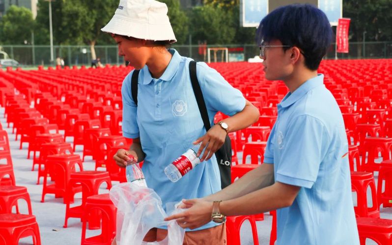 尽心尽力,团结奋进。下午16点,新同学们在顺利完成报到注册工作后,来到东操场与自己班级的助学导师集合,为开学典礼现场搬运矿泉水并给各座位分配矿泉水。虽然烈日炎炎,在公司各部门老师的指导下,从志愿者集合到分配工作,同学们秩序井然,认真听从负责老师安排,很快就投入到劳动之中,尽管大家第一次见面,但相互配合默契,团结协作。不论男生女生,大家活力十足,取水、搬水、摆水的工作有条不紊,不出一个小时大家就顺利完成了开学典礼现场矿泉水分配与家长席座位布置工作。在劳动中,新生们不仅体验到了团队合作的力量,更深刻理解了“劳动最光荣、奋斗最幸福”的深刻内涵。汗水浸湿了衣背,但他们的脸上却洋溢着满足与自豪的笑容。