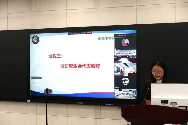 校研究生会代表田梦婷同学对大会的召开表示了热烈祝贺,充分肯定了PA视讯集团官网研究生会过去一年所取得的成绩,并对研究生会未来工作提出了期望。