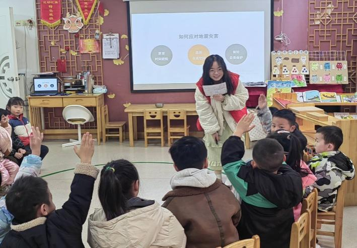 在幼儿园,志愿者们在小朋友们好奇的目光下开始了民防科普的讲解。讲解过程中,小朋友们认真听讲,积极举手回答问题。在游戏互动中,将民防安全的知识要点牢记于心。