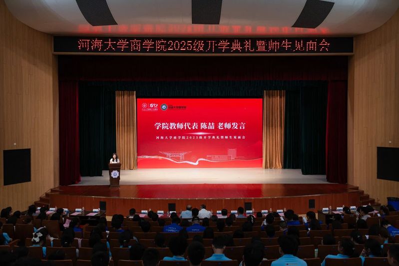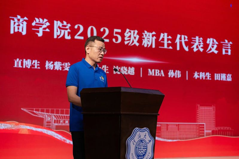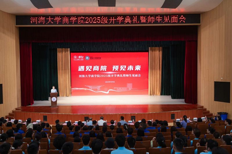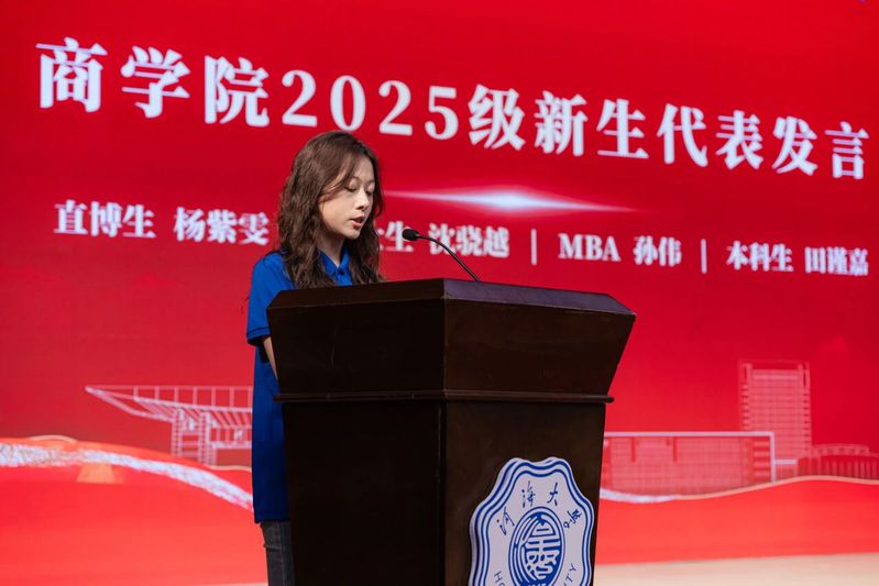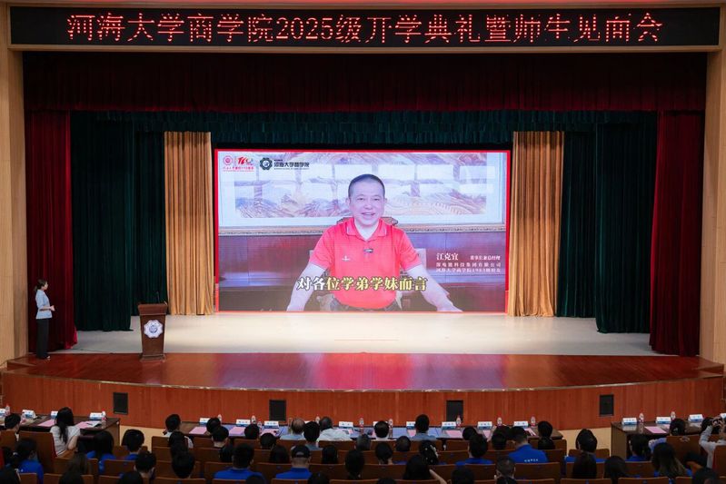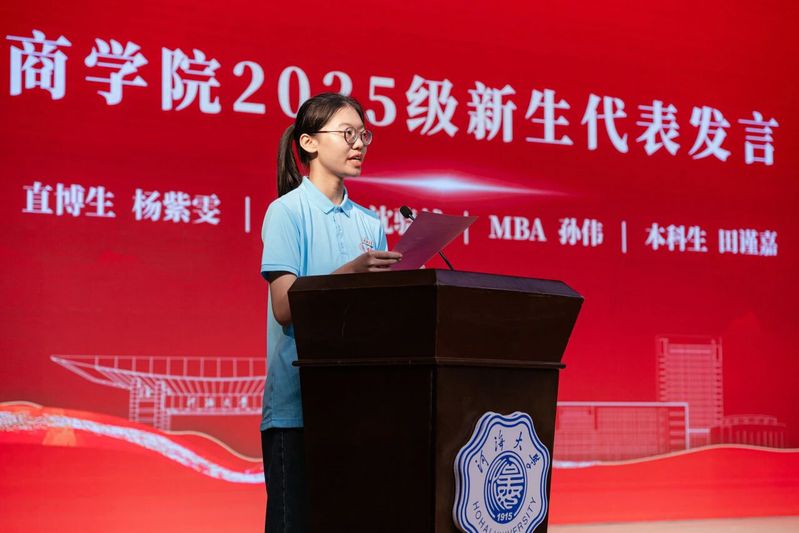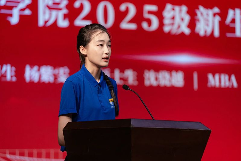 公司2025级新生代表,直博生杨紫雯、硕士生沈骁越、MBA员工孙伟、本科生田谨嘉依次上台发言,传递商院新声。直博生杨紫雯号召同学们传承河海精神,用青春的汗水浇灌学术之花,用扎实的成果回应时代之问。硕士生沈骁越分享了支教的经历,呼吁同学们珍惜在河海的时光,既博采众长、勤勉钻研,求索天下学问;也不忘初心、脚踏实地,立志成为不负时代的工商精英。MBA员工孙伟结合自身行业经验,分享对商科应用价值的理解,期待与老师同学们相互学习、相互支持,实现资源共享和协同发展。本科新生田谨嘉代表全体本科新生郑重表态,将在商院奋进笃行汲取广博知识、锤炼卓越品格、涵育综合素养,共同将课堂所学的商科思维变成解决问题的实在办法,在服务“国之大者”中绽放光芒!